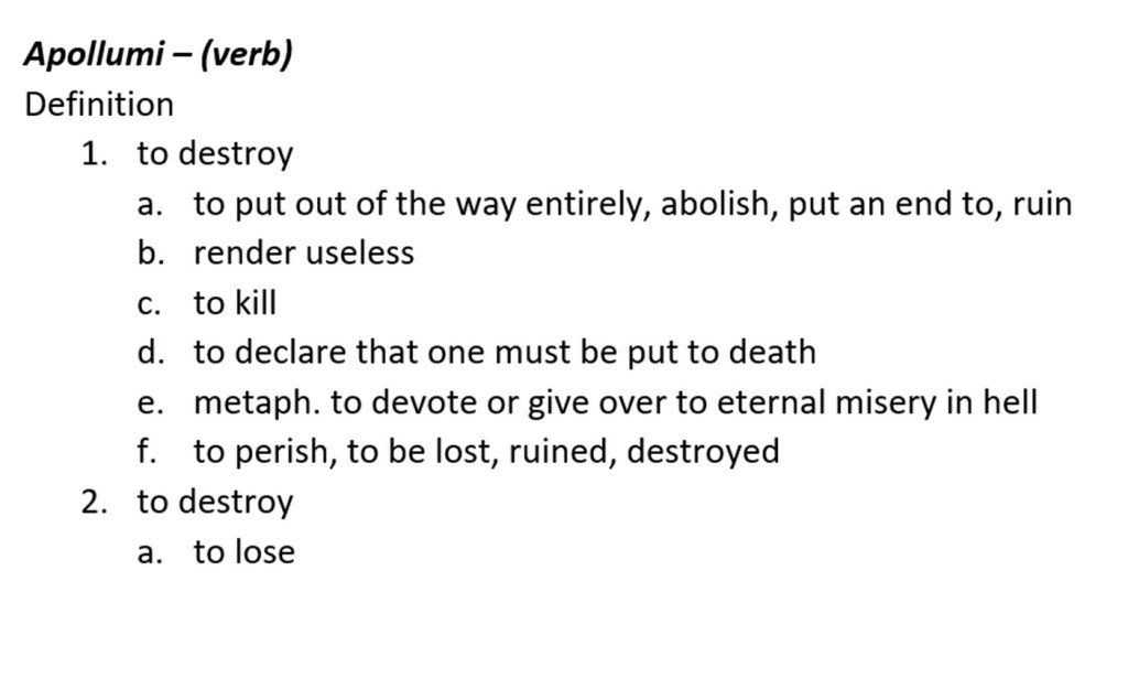 Young defines apollumi as “to loose, loose away, destroy” (Young, LLD, Robert, Young’s Analytical Concordance of the Bible, Wm. Eerdmans Publishing Co., Grand Rapids: ©1962)